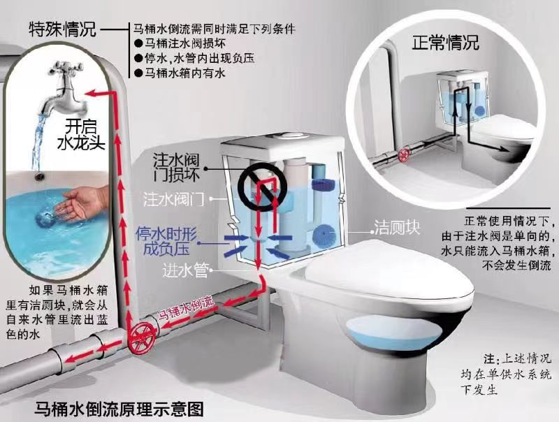 個(gè)別用戶發(fā)現(xiàn)從水龍頭中放出的自來(lái)水有時(shí)會(huì)呈現(xiàn)藍(lán)色。出現(xiàn)這種現(xiàn)象是因?yàn)橛脩粼趲鋬?nèi)放有潔廁靈(藍(lán)色),同時(shí)馬桶進(jìn)水管止回閥損壞導(dǎo)致。正常情況下,在管網(wǎng)壓力的作用下,水的流向是正向的。但由于停水或者樓下有用水,在開啟閥門或水龍頭的瞬間,由于水流的突然變化,使樓上未用水的管道內(nèi)產(chǎn)生了瞬時(shí)負(fù)壓,將水箱內(nèi)的水抽入管道內(nèi),即產(chǎn)生了藍(lán)水現(xiàn)象。只需加裝止回閥,即可解決問(wèn)題。