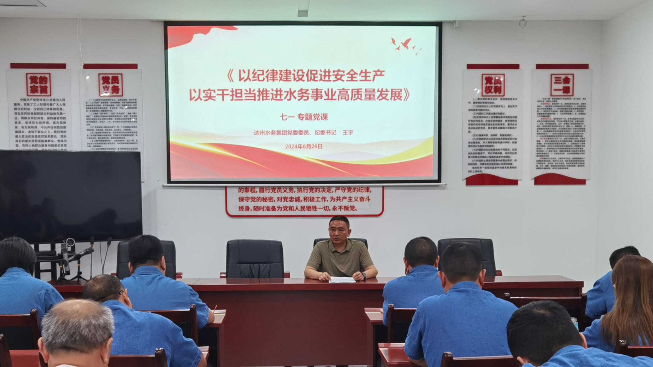 6月26日上午集團(tuán)公司黨委委員、紀(jì)委書記王宇同志惠潤達(dá)公司支部以《以紀(jì)律建設(shè)促進(jìn)安全生產(chǎn) 以實(shí)干擔(dān)當(dāng)推進(jìn)水務(wù)事業(yè)高質(zhì)量發(fā)展》為主題,講了一堂專題黨課。