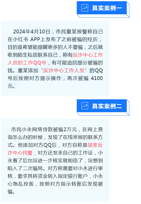 受害人在QQ、網(wǎng)上搜索“反詐中心”“在線報(bào)警”,騙子會(huì)假模假樣地指導(dǎo)受害人提供證據(jù)材料,再提出讓受害人向指定賬戶轉(zhuǎn)賬,最后導(dǎo)致受害人二次陷入騙局。