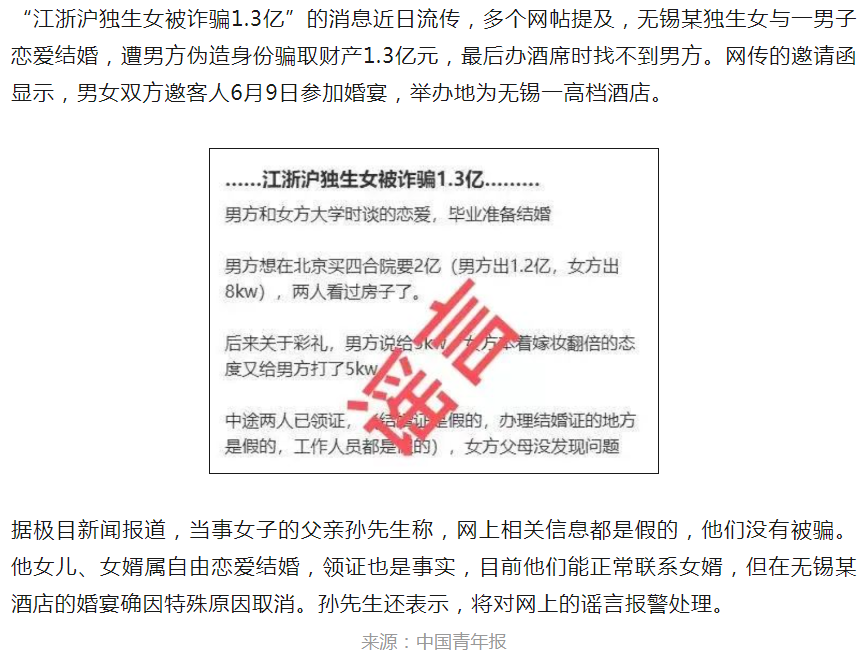 6月15日,江蘇無錫市公安局錫山分局發(fā)布通報稱,無錫居民浦某某(女,42歲)13日在微信群內(nèi)討論“江浙滬獨生女被詐1.3億”等不實言論,并僅憑主觀聯(lián)想,與某集團(tuán)女高管關(guān)聯(lián),通過網(wǎng)絡(luò)傳播擴(kuò)散造成不良影響。目前,公安機(jī)關(guān)已依法對浦某某處以行政拘留。