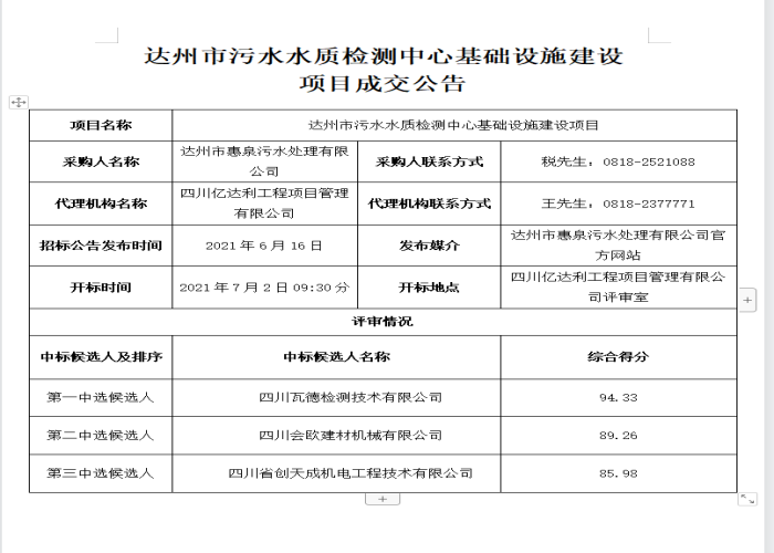 標(biāo)題:達(dá)州市污水水質(zhì)檢測(cè)中心基礎(chǔ)設(shè)施建設(shè)項(xiàng)目成交公告